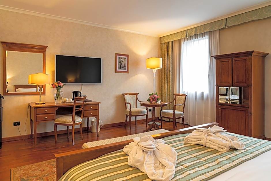 This spacious and elegantly furnished suite is fitted with parquet floors and wooden furnishings. It is soundproofed and features a seating area, an LCD TV with satellite channels, a mini-bar, and air conditioning. The en suite marble bathroom is complete with free toiletries and a hairdryer.